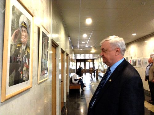 От себя Георгий Владимирович добавил, что находится под большим впечатлением от выставки. Рисунки детей 6-14 лет, названные, например, «Береги себя и дочку», «Молодой партизан» и т.д., показывают, что, несмотря на прошедшие годы и десятилетия, зерна брошены в благодатную почву, растет достойная смена, а это означает, что нашу Родину не победить никому и никогда. День Победы вот уже 70 лет был, есть и будет главным праздником России, это праздник не одного дня, а всей жизни, и он включает чувство благодарности ко всем ветеранам за победу. Это также и символ памяти и скорби, ведь ни одна семья не прошла мимо потери близких и родных. Георгий Владимирович поблагодарил «правофланговое Московское областное отделение» за прекрасно организованное чествование.