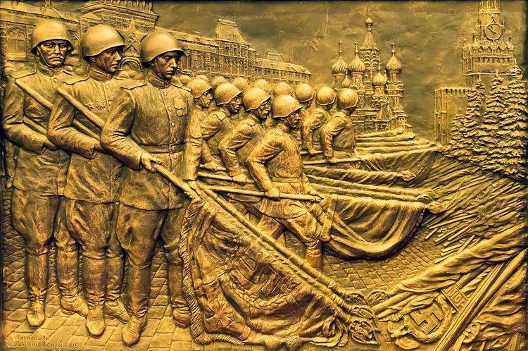 Участник Парада Победы 1945 года гвардеец-кантемировец Алексей Григорьевич Иванов поделился воспоминаниями о подготовке и проведении легендарного Парада. Общая численность войск на параде составила около 40 000 человек, которые шли, чеканя шаг, под проливным дождем. Сводный военный оркестр состоял из 1400 человек, для каждого проходившего полка исполнялся особый марш. По личному приказу И.В. Сталина, на его кителе был пронесён раненный незадолго до окончания войны служебный пёс-сапёр Джульбарс, обнаруживший более 7 тысяч мин и 150 снарядов. Марш сводных полков завершала колонна солдат, нёсших 200 опущенных знамён и штандартов разгромленных немецких войск, которые под дробь барабанов были брошены на специальный помост у подножия Мавзолея Ленина. Низложение немецких знамён намеренно проводилось в перчатках, чтобы