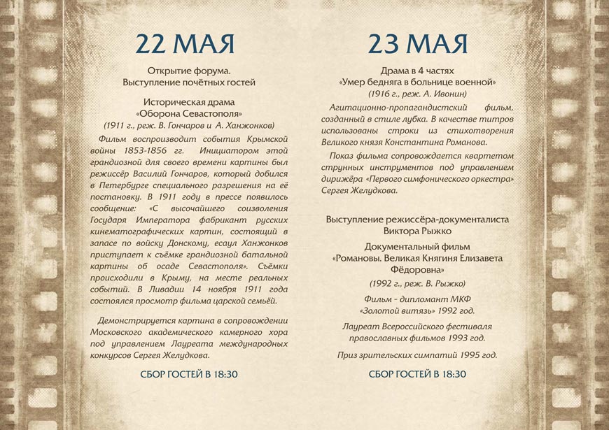 В рамках кионфорума будут показаны также дореволюционные фильмы «Оборона Севастополя», продемонстрированный царской семье в Ливадии 14 ноября 1911 года, и агитационно-пропагандистский фильм 1916 года «Умер бедняга в больнице военной».