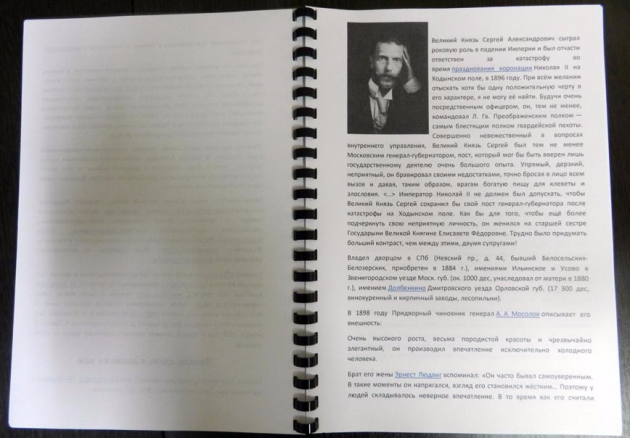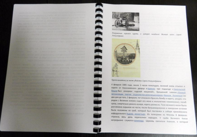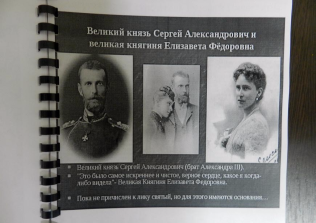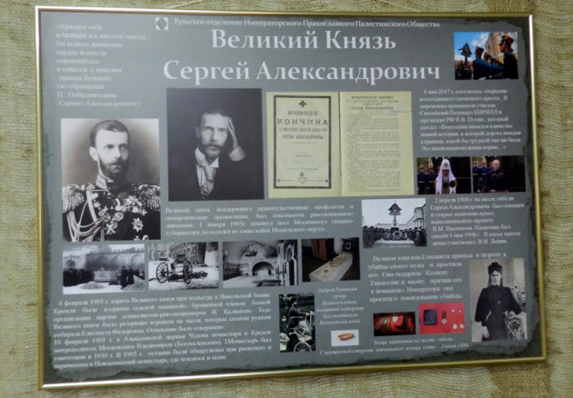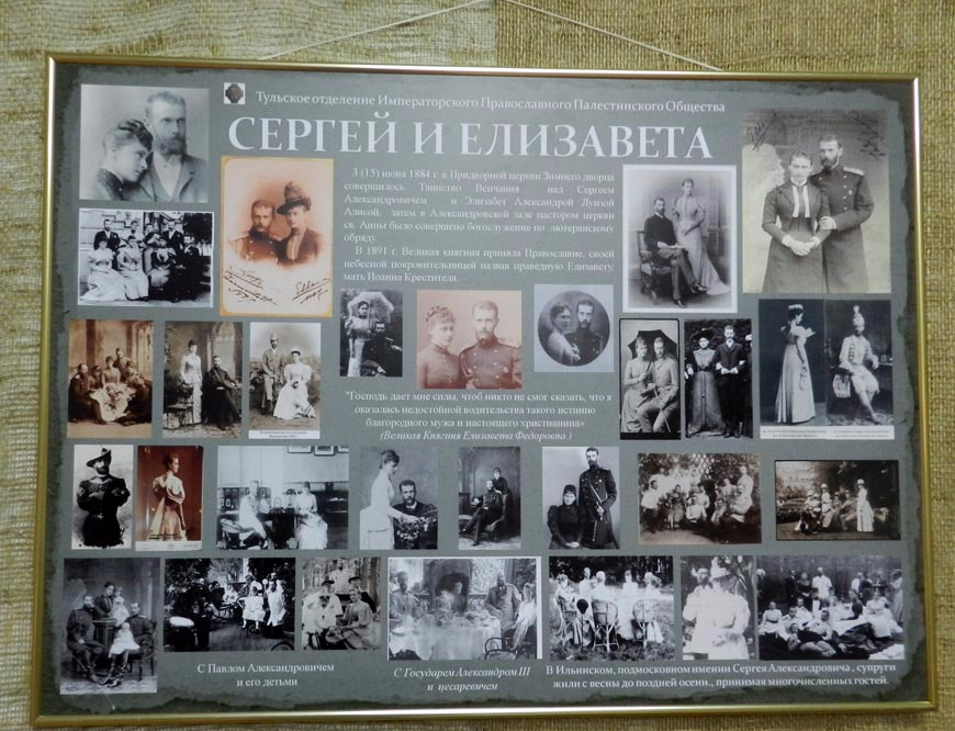 Выставка подготовлена Тульским отделением ИППО и представляет собой 12 планшетов, на которых репродуцированы многочисленные фотографии и сопроводительные текстовые материалы, рассказывающие о жизни и трудах Великих князя и княгини. Один из планшетов полностью посвящён их деятельности на ниве ИППО. Большой интерес вызывает и планшет, посвящённый визиту Елизаветы Фёдоровны в Тулу. Впрочем, все без исключения фотографии надолго заставляют остановиться и всмотреться в удивительно просветлённые, исполненные внутреннего благородства лица.