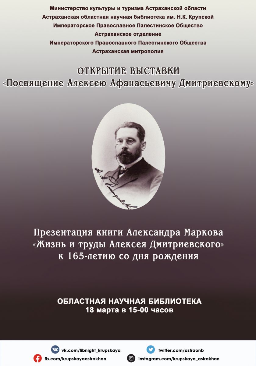 Автор рассказал о процессе работы над книгой, созданной на основе материалов из фонда отдела рукописей Российской национальной библиотеки. С сообщениями о малоизвестных фактах из жизни Алексея Дмитриевского выступили протоирей Роман Сколота, настоятель храма Иконы Божией Матери «Знамение», руководитель Миссионерского отдела Астраханской епархии, кандидат исторических наук, член Совета Астраханского отделения ИППО; Наталья Власова, научный сотрудник Астраханского краеведческого музея-заповедника, секретарь Астраханского отделения ИППО; краевед Сергей Львов, председатель Астраханского отделения Союза писателей России Юрий Щербаков, коммерческий директор типографии «Новая линия» Татьяна Ринк.