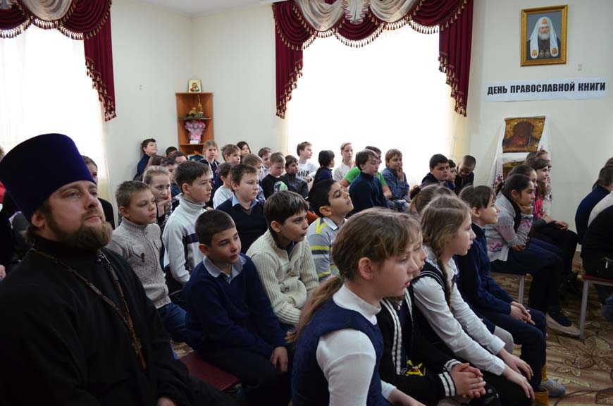 В актовом зале духовно-просветительского центра была представлена выставка православной книги, как современной, так и старопечатной. Школьники смогли увидеть пожелтевшие страницы церковных книг XVIII-XIX веков, богослужебные фолианты в ювелирных ризах, детские издания духовно-нравственной тематики.