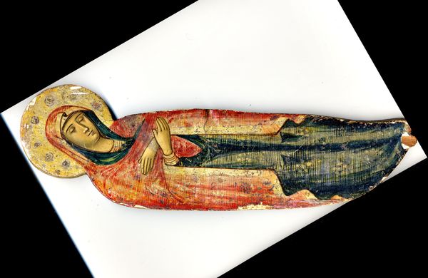 Начиная с середины XIX века в России получили особое распространение многочисленные списки с так называемой Гефсиманской плащаницы, привозимые богомольцами со Святой Земли. Это небольшие деревянные, вырезанные по контуру плоские фигуры, на которых изображена лежащая Божия Матерь с закрытыми глазами и сложенными на груди руками (илл. 7). Как правило, подобные паломнические копии расписаны цветными красками и лаками по золоту только с лицевой стороны, на обороте встречаются чернильные штампы «Благословение Святаго Града Иерусалима» и дарственные надписи, например, такие: «Благословение от Гроба Божией Матери Гефсиманской настоятель обители архимандрит Макарий ‘1889’», «Гробница Божией Матери. Гефсимания» (илл. 8). Большинство из сохранившихся изображений можно датировать, согласно стилю и подписям на оборотной стороне, второй половиной XIX– началом XX века. Нередко уже в России такие плащаницы украшались шитыми бисерными ризами, вставлялись в иконы с композицией Успения Богородицы.