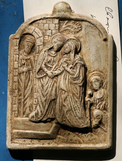 Илл.17. Целование Богородицы и праведной Елисаветы. Резная икона на камне из Иордана. Последняя треть XIX века. Иерусалим. Новокузнецкий музей. На обороте резная надпись: «иорданский камен».