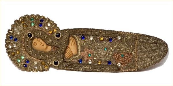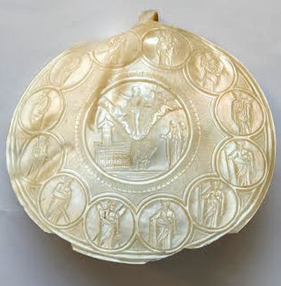 В XVIII–XIX веках из Святой Земли часто привозили иконки, резанные по перламутру – традиционному материалу для мастеров из Палестины. Главными центрами их изготовления являлись Вифлеем и Иерусалим, где в начале XIX века даже была открыта школа резьбы по перламутру/8/. Искусно выполненные прорезные и рельефные узоры цветов и растений (тюльпанов, роз, ветвей пальмы и лавра), профессионально разработанные многофигурные композиции свидетельствуют о том, что мастера, православные арабы (мелькиты), использовали сложнейшие технические приемы резьбы – от низкого рельефа до накладного горельефа, гравировки и мозаичного набора геометрического орнамента. Раковины для изготовления паломнических реликвий добывались в Персидском заливе, Красном море и Тихом океане. Они имели различные цветовые оттенки, но особенно ценился ослепительно белый перламутр с тончайшими переливами.
