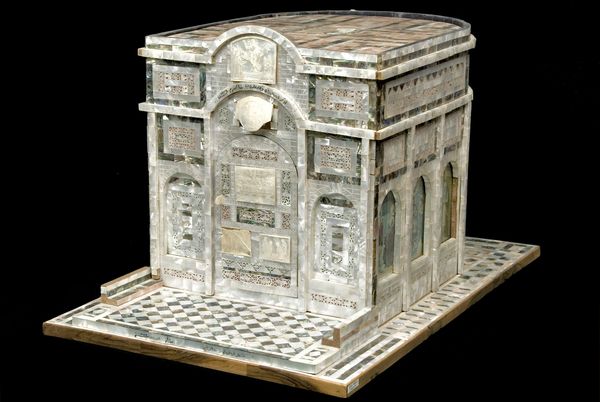 Модели храма Гроба Господня, изготовленные из дерева оливы с инкрустацией перламутром и слоновой костью, были известны с конца XVI века. В середине XIX века архимандрит Леонид (Кавелин), описывая паломнические реликвии, изготавливаемые в Вифлееме, отметил, что один из арабских резчиков сделал из масличного дерева модель Кувуклии Святого Гроба с украшением из перламутра, которую намерен был поднести в подарок «императрице французов и испанской королеве»/5/. «Превосходную модель кувуклии» поднес патриарх Иерусалимский Кирилл II великому князю Константину Николаевичу в память о пребывании на Святой Земле в 1859 году/6/. В первой половине XX века знаменитым вифлеемским мастером Бишаром аз-Зугби была исполнена модель Кувуклии Гроба Господня в технике маркетри (набор из разных перламутровых пластин, создающих эффект мерцающей поверхности), которая находится сейчас в Церковно-археологическом Кабинете Московской Православной Духовной Академии (илл. 1). Две другие свои работы мастер преподнес императору Николаю II по случаю празднования 300-летия Дома Романовых/7/.