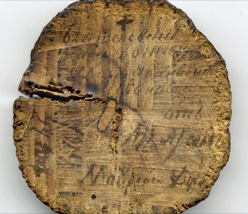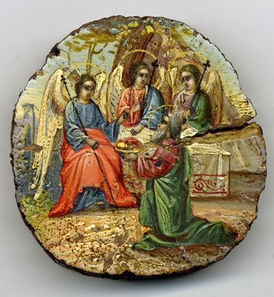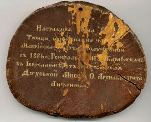 Илл.12. Святая Троица Ветхозаветная. Икона на спиле Мамврийского Дуба. После 1886 года. Палестина, Россия. Собрание А.С. Колпачева. На обороте надпись: «Настаящая икона [Святой] Троицы, написана[я] на ча[сти] Маврийскаго дуба[,] полученной в 1886 г., Генерало[м] М. […] Карауловым в Иерусалиме, от настоятеля Духовной Миссии О. Архимандрита Антанина».