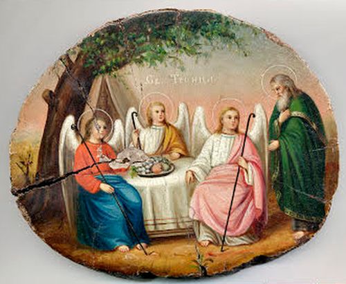 Илл.11. Святая Троица Ветхозаветная. Икона на спиле Мамврийского Дуба. Начало XX века. Палестина. Частное собрание. На обороте надпись чернилами: «+ Благословение рабе Божией Марии Ивановне [Ивановой] от Арх. Арсен[ия] Маврийск. Дуб. 1914 24 Апр.».
