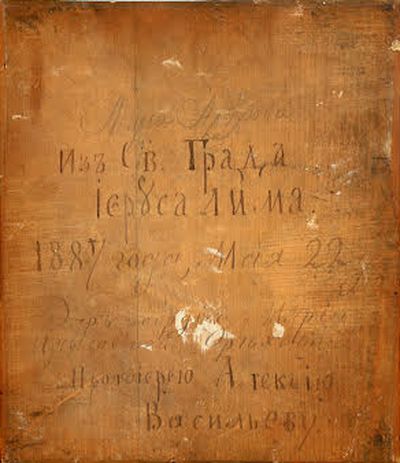 Илл.3. Господь Вседержитель. Икона. Около 1887 года. Частное собрание. На обороте надпись карандашом на греческим языке и надпись чернилами: «Из Св. Града Иерусалима. 1887 года, Мая 22 д[ня]. Дар усердия Марии Павловной Ореховой Протоиерею Алексию Васильеву».