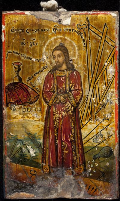 Палестинские иконы легко узнаваемы благодаря своим сюжетам и характерному художественному исполнению, в котором соединились особенности различных традиций (илл. 3). На них встречаются греческие, славянские, арабские надписи. При этом все палестинские иконы, как правило, написаны темперой на доске без ковчега, фон и одежды покрыты золотом, на фоне прочеканены необычные орнаменты, колорит создается несколькими открытыми цветами, притенения выполнены цветными лаками. Обильное использование золота и лаков создавало эффект драгоценной, светящейся поверхности, который скрашивал зачастую неточности и упрощения авторского рисунка. На оборотах таких икон нередко можно встретить памятные или дарственные надписи с датами посещения паломниками Иерусалима. Редчайшим по сюжету является «Образ связанного Христа, что в Иерусалиме» середины XIX века – копия иконы, находящейся на Голгофе (илл. 4).