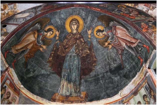 Таким образом, те фрески, которые мы сегодня видим в храме, относятся к различным эпохам. Несомненно, наиболее важными являются древние фрески. Ктиторская надпись, которая начинается от северной части западной колонны южной стены и продолжается до западной арки, гласит: «Храм Пресвятой Богородицы был расписан благодаря многим трудам Никифора Воеводы, поставленного Государем нашим Императором Алексием Комниным в 1105–1106 годах». В росписи сказались новые веяния иконной изобразительности эпохи Комнинов. Мастер старательно воспроизводит особенности самых выдающихся фресок Константинополя той эпохи.