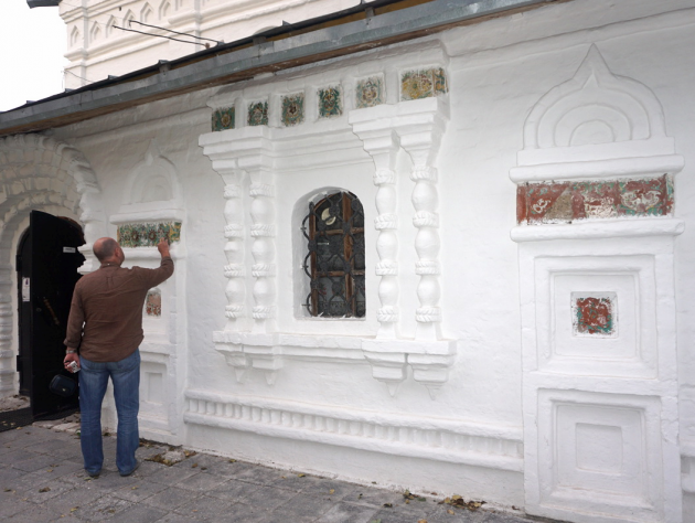Архимандрит Тихон (Затёкин) и С. Б. Судьин осматривают изразцы