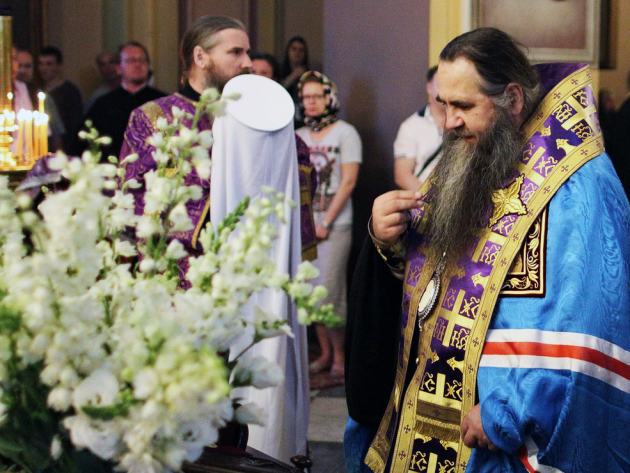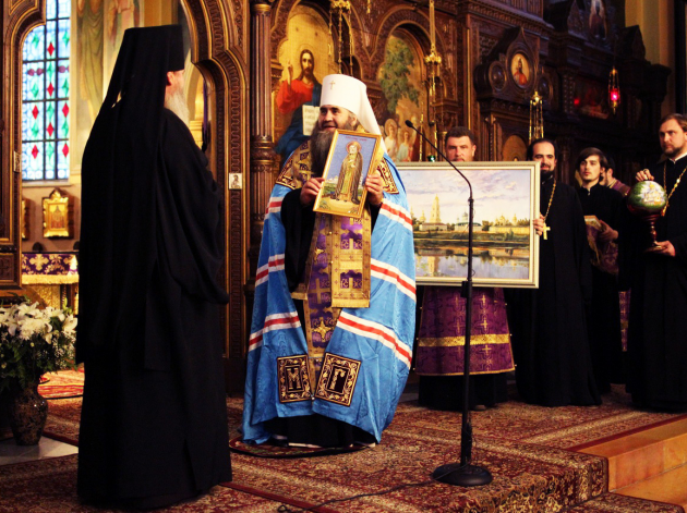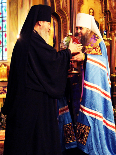 После молитвы архимандрит Александр обратился к митрополиту Нижегородскому и Арзамасскому Георгию с приветственным словом, в котором выразил особую радость принимать посланников со своей малой родины и посланников святого Старца Серафима Саровского.