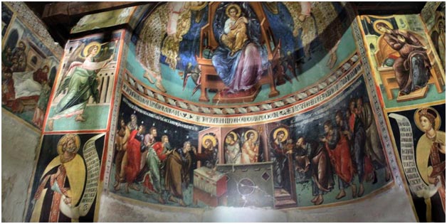 Церковь расписана не целиком. Фрески покрывают лишь внешнюю сторону западной стены, треугольник западной стены изнутри, треугольник восточной стены, апсиду и восточную часть северной и южной стен.