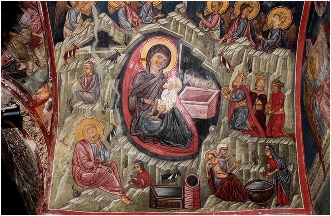 Ещё одна фреска – святая Мария, грудью кормящая Младенца. Она находится справа от иконостаса и, как предполагается, была написана в XIV веке. Она никогда не реставрировалась, а потому сохранила оригинальные цвета и краски.