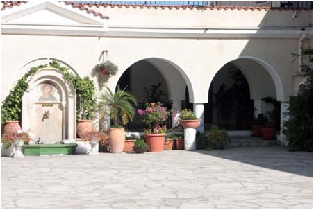 У въезда в монастырь, слева от арки, открывающей дорогу к постройкам обители, паломников встречает Святой Георгий на коне. За спиной у храброго воина сидит прекрасный юноша, спасенный им из страшного арабского плена. Это знаменитая и очень любимая на Кипре сцена жития святого представляет на монументальном барельефе, как бы предваряющем вход в монастырь.