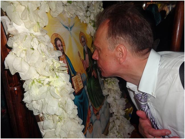 Святейший и Блаженнейший Патриарх Иерусалимский и всея Палестины Феофил III возглавлял праздничную Литургию вместе с Начальником Русской Духовной Миссии в Иерусалиме, членом Совета ИППО его Высокопреподобием архимандритом Александром (Елисовым).