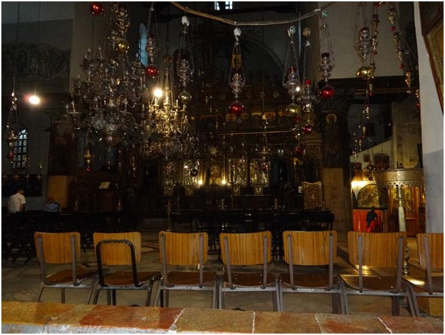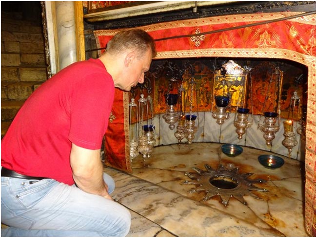 Затем нужно спуститься ещё на тридцать ступенек к месту рождения Иисуса Христа. Вся пещера освещается лампадами, пол выложен мрамором.