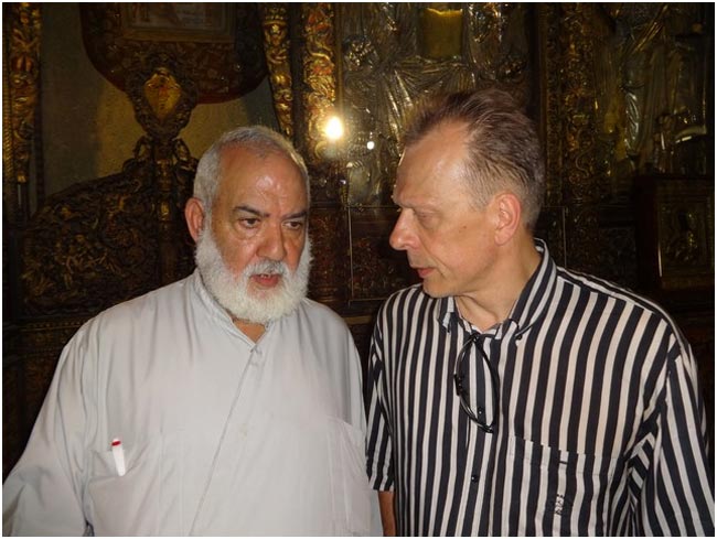 Священник базилики Рождества Христова отец Спиридон и председатель Кипрского отделения ИППО Леонид Буланов