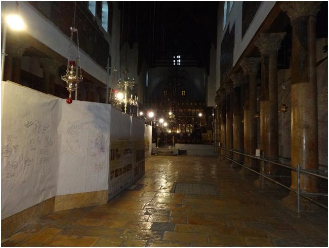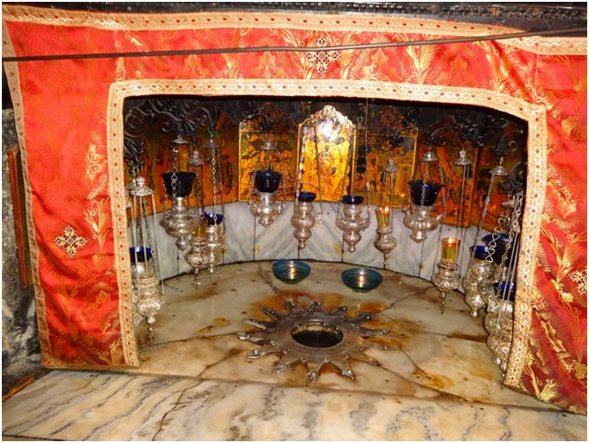 По внутреннему кругу звезды надпись по-латыни: «Hic de Virgine Maria Jesus Christus natus est» (Здесь от Девы Марии родился Иисус Христос). Вокруг этой ниши постоянно горят 15 лампад, 6 из которых принадлежат православным грекам, 5 армянам и 4 католикам. Паломники преклоняют колена и благоговейно прикладываются к серебряной звезде.