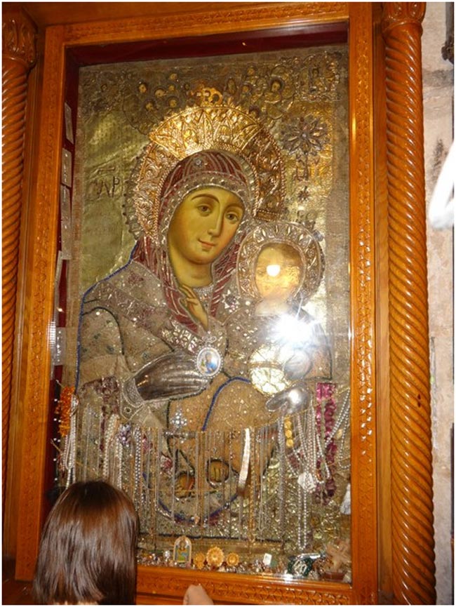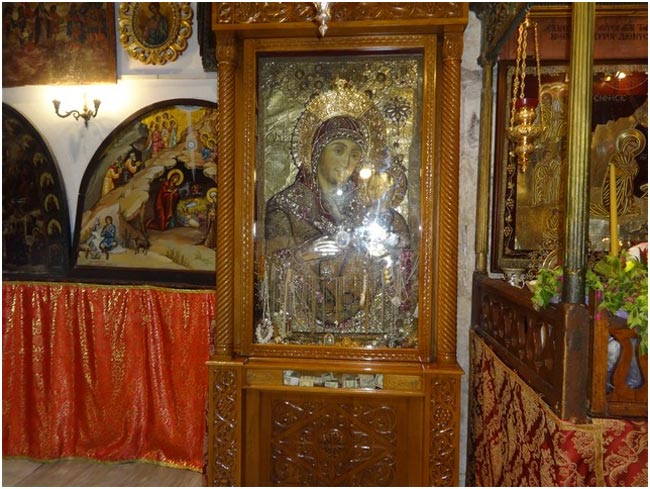 Вблизи от спуска в пещеру, где родился Иисус, поставлена чудотворная икона Вифлеемской Божьей Матери. Это единственный образ, где Пресвятая Богородица улыбается, ведь именно здесь, в Вифлееме, она была счастлива.