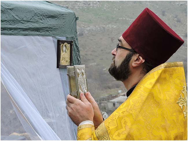 Божественная литургия совершалась в приспособленной для богослужения походной палатке, так как молиться в пещерном храме опасно – с его сводов периодически падают обломки скалы. Литургию возглавил настоятель общины иерей Александр Леонов. Все участники богослужения причастились Святых Христовых Таин.