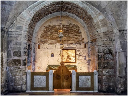 Обойдём вокруг Кувуклии вдоль широкой галереи, описывающей большой полукруг и служившей когда-то западным притвором храма. Нижний ярус Ротонды имеет три симметричные апсиды – на юг, запад и север. Вся южная часть принадлежит, как мы уже говорили, армянам. В западной апсиде, напротив коптской часовни, расположен так называемый «придел Никодима», принадлежащий Сирийской (Сиро-Яковитской) Церкви. Теперь и им владеют армяне, разрешающие сирийскому духовенству совершать здесь богослужение по воскресным и праздничным дням. Тогда облачается алтарь, и придел приобретает привычный церковный облик. В другие дни это самый сиротливый и неухоженный из приделов Храма.