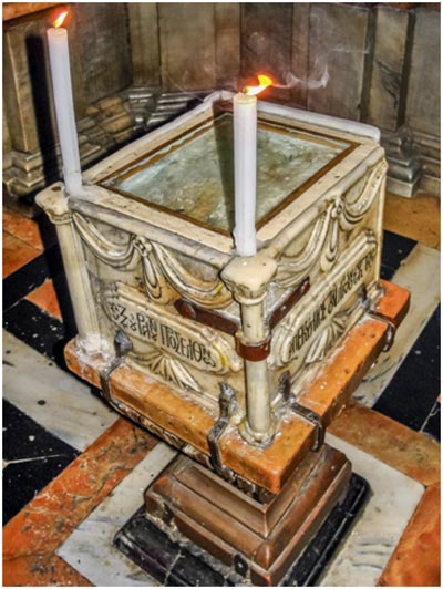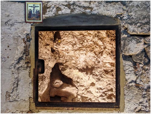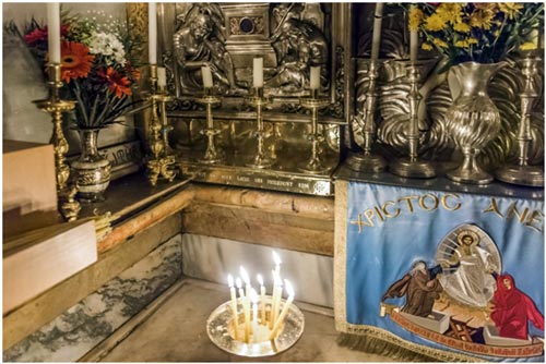 ...И мы входим в пещеру Гроба. Маленькая камера (207 х 193 см) почти наполовину занята справа каменным ложем, покрытым мраморной плитой. Она впервые появилась в Кувуклии в 1555 г. и нарочно разрезана пополам, будто бы для того, как сказано в источниках, чтобы турки не польстились и не украли её. Последний человек, который видел в 1810 году подлинное каменное ложе Спасителя, Максим Симейский, свидетельствовал, что оно было сильно повреждено неразумной ревностью бесчисленных «боголюбцев», норовивших отломить, откусить, любой ценой унести с собой кусочек реликвии.