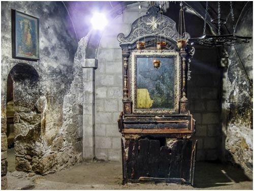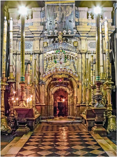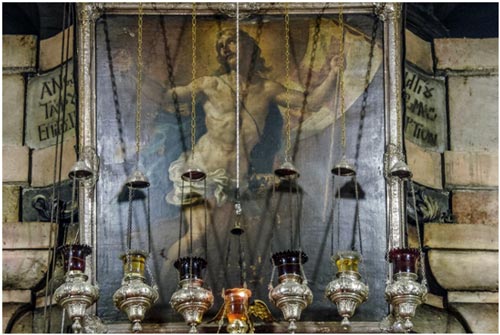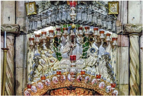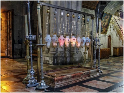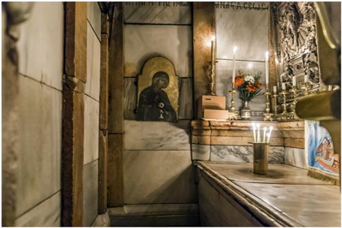 Продолжая осмотр, вы заметите на западной стене Гробницы, слева от мраморного ложа, икону Богоматери редкой иконографии. Пресвятая Дева изображена на ней как мироносица – с сосудом святого мира в руках. Часовню осеняют 15 лампад, в три ряда, – тоже по числу основных исповеданий.
