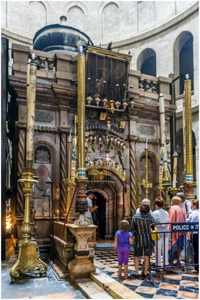 Почти всегда вереница верующих – разных стран, наций, исповеданий – стоит перед Кувуклией, ожидая своей очереди войти помолиться на Святом месте. Размер Гробницы не позволяет поместиться в ней более чем троим-четверым. Поэтому неписанный обычай позволяет каждому провести здесь в коленопреклоненной молитве не больше 3 минут. Многие кладут на Святое Ложе принесённые с собой святыни, крестики, медальоны, которые получают при этом освящение, превышающее по благодатной силе любое другое. Не секрет, что православные паломники (особенно паломницы) стараются по возможности непременно коснуться устами и челом головной, западной части ложа. От усердия паломников здесь образовалось, если присмотреться, заметное углубление.