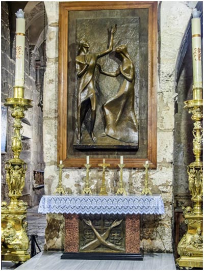 Северная часть Ротонды принадлежит Католической Церкви. Первое, что мы видим, – это придел, точнее, престол Марии Магдалины. Над ним, на восточной стороне массивного столпа, – современная икона, изображающая встречу Магдалины с воскресшим Спасителем. Динамичное, с удлинёнными пропорциями фигур, в резком ракурсе выполненное изображение, хотя и несёт на себе безошибочно узнаваемую стилевую печать немецкого экспрессионизма 1920-х годов, не лишено своеобразной религиозной одухотворённости.