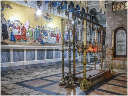 У подножия Голгофы, прямо напротив входа в храм, лежит Камень Помазания. На этом камне, согласно преданию, снятое с Креста безжизненное тело Иисуса было уготовано для погребения и помазано миром. Соответствующий евангельский текст написан по-гречески на мраморной доске, расположенной рядом. «После сего Иосиф Аримафейский… просил Пилата, чтобы снять тело Иисуса; и Пилат позволил. Он пошёл и снял тело Иисуса. Пришёл также и Никодим, – приходивший прежде к Иисусу ночью, – и принёс состав и смирны и алоя, литр около ста. Итак они взяли тело Иисуса и обвили его пеленами с благовониями, как обыкновенно погребают Иудеи» (Ин. 19: 38-40). Вся последовательность изложенных в Евангелии событий: снятие с Креста, умащение тела благовониями и положение во Гроб, – изображены на большом мозаичном панно, расположенном на стене, непосредственно за Камнем Помазания. Мозаика, выполненная не так давно, по благословению Патриарха Диодора, искусно стилизована под византийские образцы.