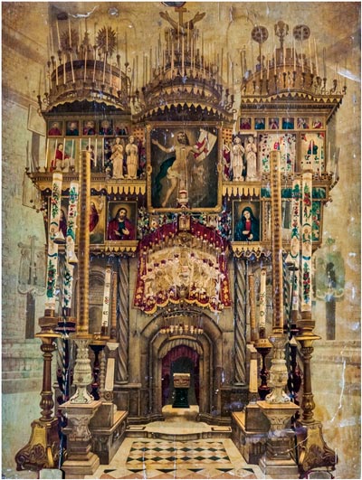Но вернёмся к Кувуклии – такой, как мы видим её сегодня. Невысокий, в одну ступеньку, подиум соединяет её с Триумфальной Аркой и открывающимся за ней Храмом Воскресения. Перед входом в Кувуклию по обе стороны расположены невысокие мраморные преграды со скамьями, на которых – и за которыми – стоят высокие подсвечники, принадлежащие как православным, так и католикам, и армянам. Они возжигаются последовательно при начале службы каждого из исповеданий. Над входом в Кувуклию в четыре ряда висят лампады. Всего их 40. 13 – верхний ряд – латинские, 13 – нижний – армянские. Столько же – два средних ряда лампад – принадлежит православным. Число лампад строго оговорено и входит в условие общего status quo. Так, например, когда Великая княгиня Елисавета Феодоровна хотела пожертвовать в храм в 1907 г. серебряную лампаду в память об убитом Великом князе Сергии Александровиче, Председателе Императорского Православного Палестинского Общества, Патриарх Иерусалимский Дамиан благословил заменить новой, русской поминальной, лампадой одну из прежних греческих, с точным совпадением рисунка и размера.