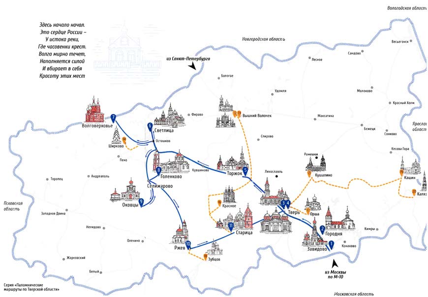 Что касается маршрута «В Тверскую область по велению души», то сначала он появился как семейный маршрут автора этих строк. В течение нескольких лет, раз в году, мы садились в машину и проезжали один и тот же маршрут, который сложился как-то сам собой: Тверь, Торжок, монастырь Нилова Пустынь, Селижарово, Святой Оковецкий ключ, Ржев, Старица и снова Тверь.