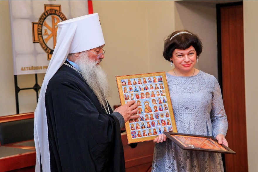 Перед награждением победителей выставки владыка Сергий вручил удостоверения действительных членов ИППО и нагрудные знаки протоиерею Андрею Ушакову и главе Заринского района В. Ш. Азгалдяну.