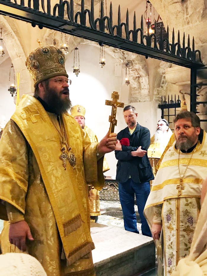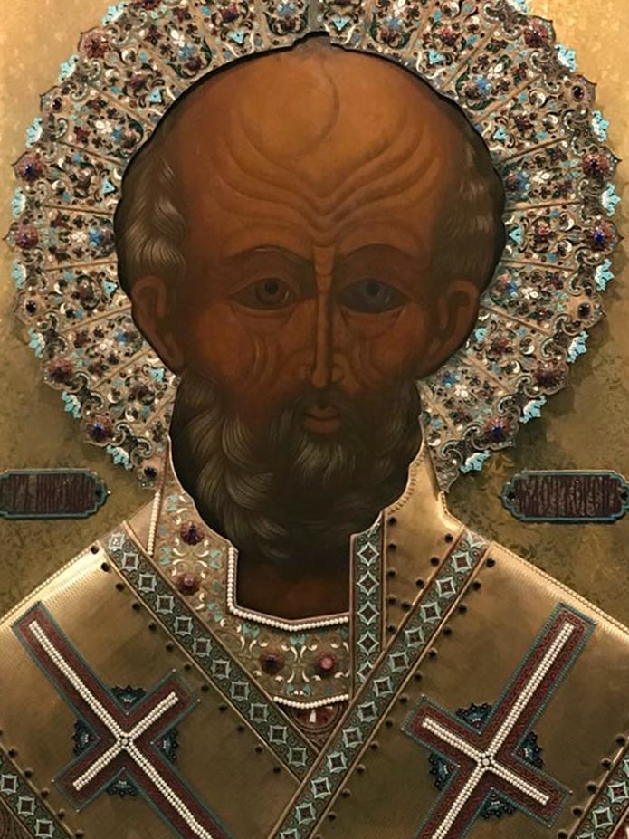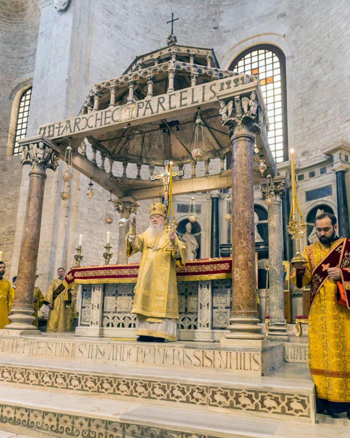 По окончании Литургии было совершено славление святителю Николаю, после чего митрополит Ювеналий обратился со словами благодарности к настоятелю базилики во имя святителя Николая в Бари падре Джованни Дистанте за предоставленную возможность совершить в этот знаменательный день Божественную литургию у мощей святителя и чудотворца Николая. Владыка в знак благодарности передал настоятелю базилики чётки ручной работы. В свою очередь падре Джованни поблагодарил архипастыря за тёплые слова и подарок и поделился своими впечатлениями о пребывании в России летом прошлого года в составе официальной делегации Римско-католической Церкви, сопровождавшей ковчег со святыми мощами святителя Николая Чудотворца в Москву и Санкт-Петербург. Он передал в дар митрополиту Ювеналию лампаду с образом святителя Николая.