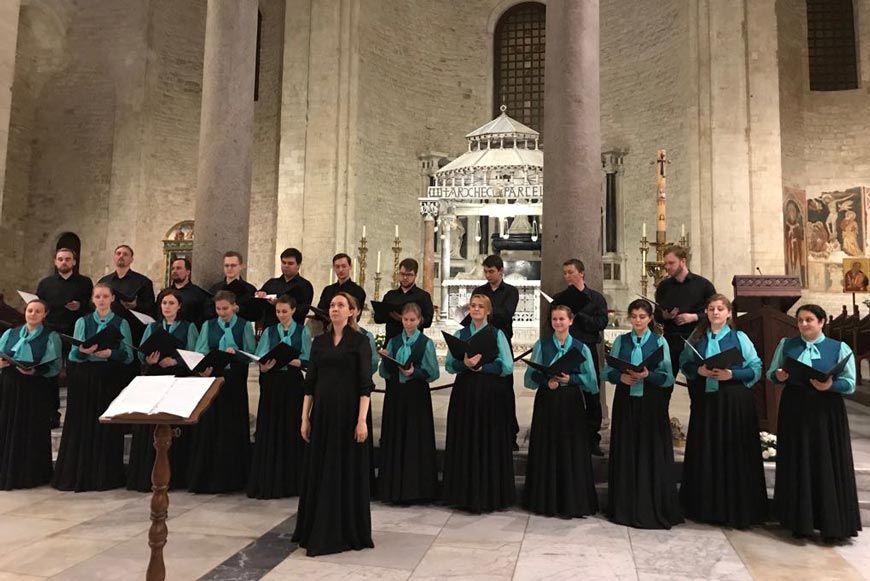 Богослужебные песнопения исполнил камерный хор Санкт-Петербургской духовной академии под руководством Раисы Гундяевой. Этот уникальный хор принимал участие не только в праздничных богослужениях, но и с большим успехом выступил с концертами в главном католическом соборе Бари.