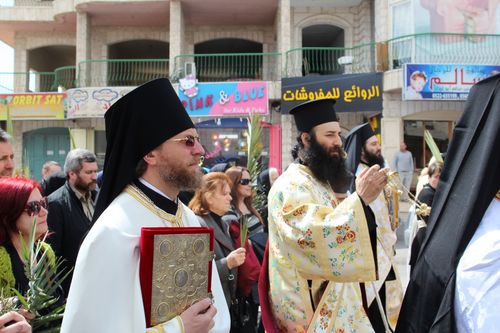 Шествие традиционно начинается в православном мужском монастыре в честь Входа Господня в Иерусалим, где находится сень над камнем, с которого Спаситель воссел на осла. Патриарх Феофил прибыл в монастырь после вечерни в храме Воскресения и совершил молебен, во время которого освятил пальмовые ветви – символ победы и вечной жизни. Такими ветвями жители Иерусалима устилали путь Христа, въезжавшего в город на молодом осле.