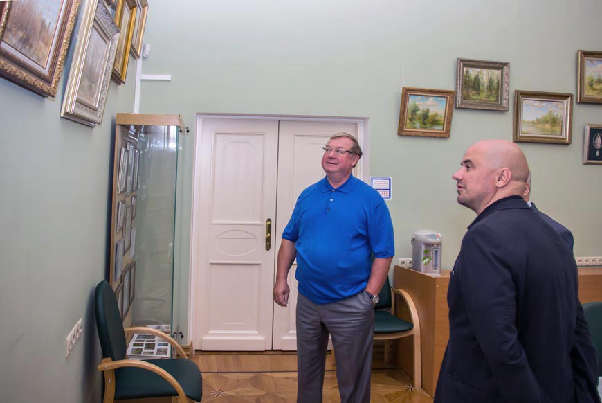 Сергей Вадимович показал гостю историческое здание Центра ИППО, выставку народного художника России Владимира Никонова. В ходе беседы были обсуждены вопросы взаимодействия нашего Общества и «Театра поэтов», в частности, достигнута договорённость о проведении осенью тематических поэтических вечеров в Центре ИППО.