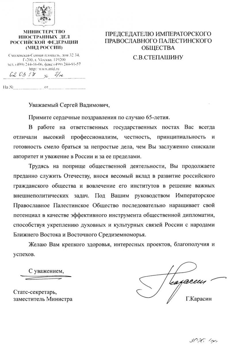 Статс-секретарь-заместитель Министра иностранных дел РФ Григорий Карасин направил поздравление Сергею Степашину по случаю его 65-летия