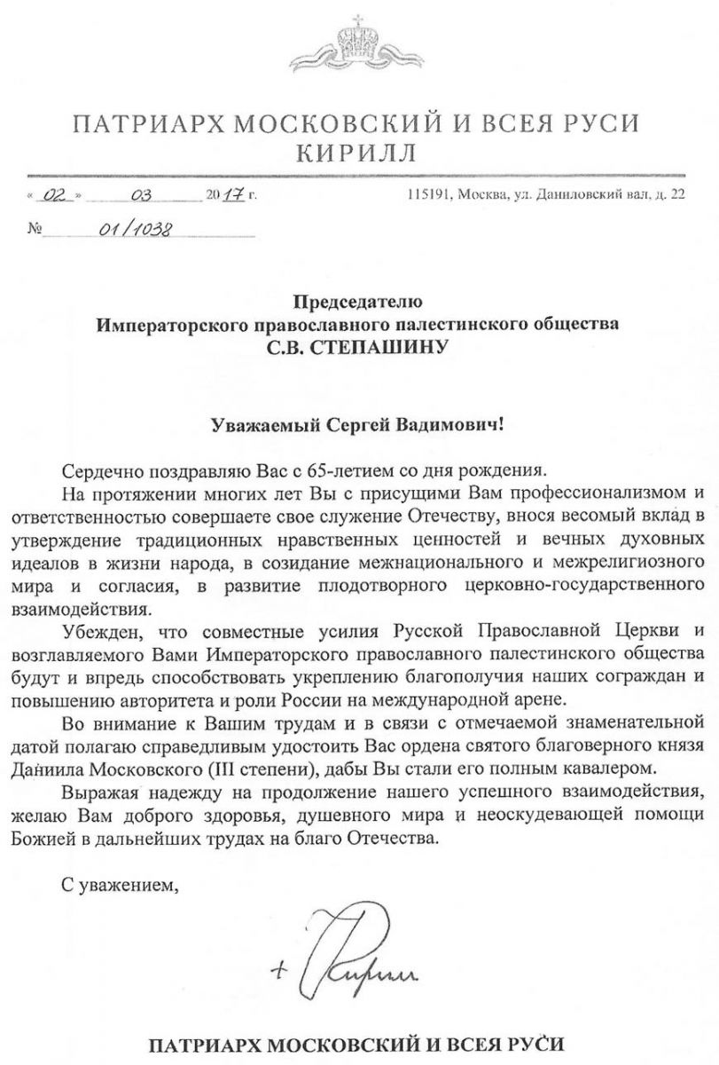 Святейший Патриарх Московский и всея Руси Кирилл, Председатель Комитета Почетных членов ИППО, поздравил Председателя Императорского Православного Палестинского Общества Сергея Вадимовича Степашина с 65-летием и удостоил его ордена святого благоверного князя Даниила Московского (III степени). Отныне он стал полным кавалером этого ордена РПЦ. Патриарх также выразил надежду на продолжение дальнейшего успешного взаимодействия.