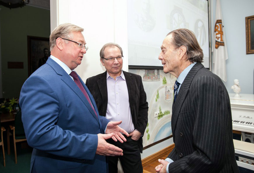 В своем обращении с приветственным словом к юбиляру Евгений Лукошков особо отметил заслуги графа Перта Петровича Шереметева в сохранении Русской консерватории имени Сергея Рахманинова в Париже - по его словам, островка русской земли и культуры во Франции.