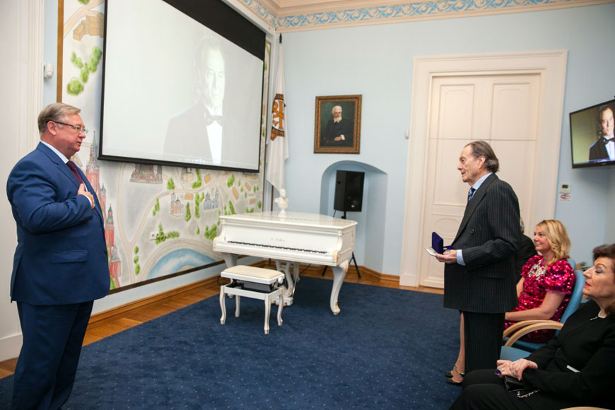 Елена Агапова подчеркнула, что в ИППО хотели бы порадовать ректора Консерватории имени Сергея Рахманинова в Париже своим музыкальным подарком-посвящением и пригласила действительного члена ИППО, народного артиста России Юрия Александровича Розума к роялю.
