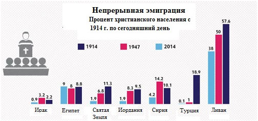 Стоит упомянуть, что эти показатели были гораздо более высокими в начале 2-й половины ХХ века. За последние сто лет численность христиан-эмигрантов составила 6 млн. человек. Таким образом, количественные показатели христианского присутствия на Ближнем Востоке в целом неуклонно и стремительно понижаются по сравнению со статистикой для других религиозных общин.