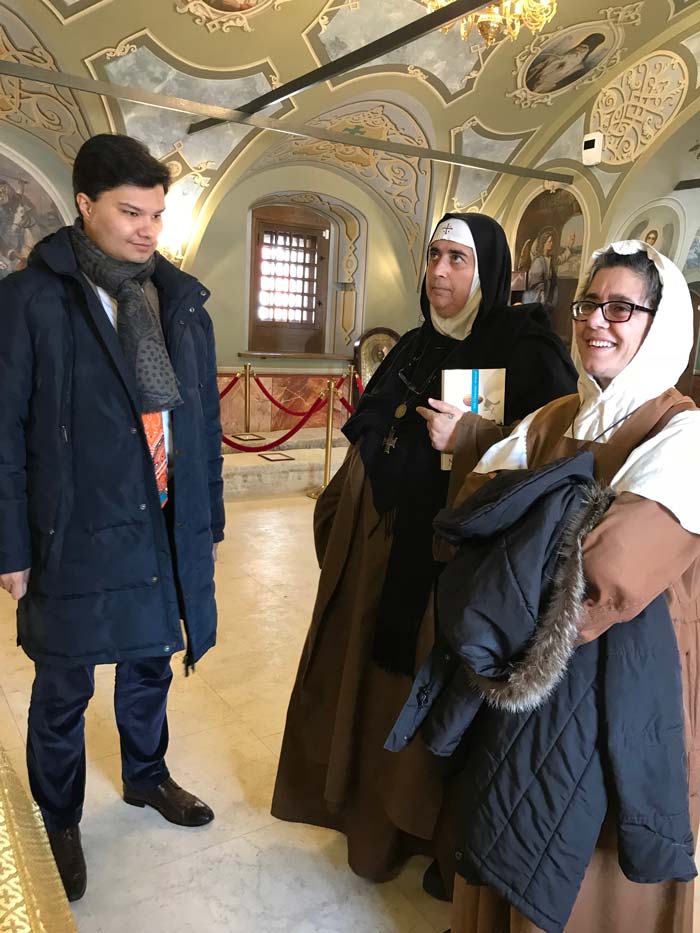 В делегации – известная своей правозащитной деятельностью католическая монахиня матушка Агнесс Мариам ас-Салиб, сестра Кармель из монастыря св. Иакова в сирийском г. Кара, общественный деятель и защитник Маалюли Абдо Хаддад. Сирийских гостей сопровождала заместитель Председателя ИППО, руководитель Общественного Центра ИППО по защите христиан на Ближнем Востоке и в Северной Африке Елена Агапова. Делегацию встречал руководитель Управления общественных связей и протокола Общецерковной аспирантуры и докторантуры, действительный член ИППО Мигель Паласио.