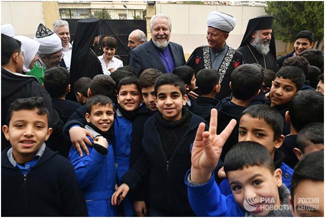 © РИА Новости / Михаил Воскресенский Участники российской межконфессиональной делегации религиозных деятелей в интернате для детей-сирот погибших военнослужащих сирийской армии в Дамаске
