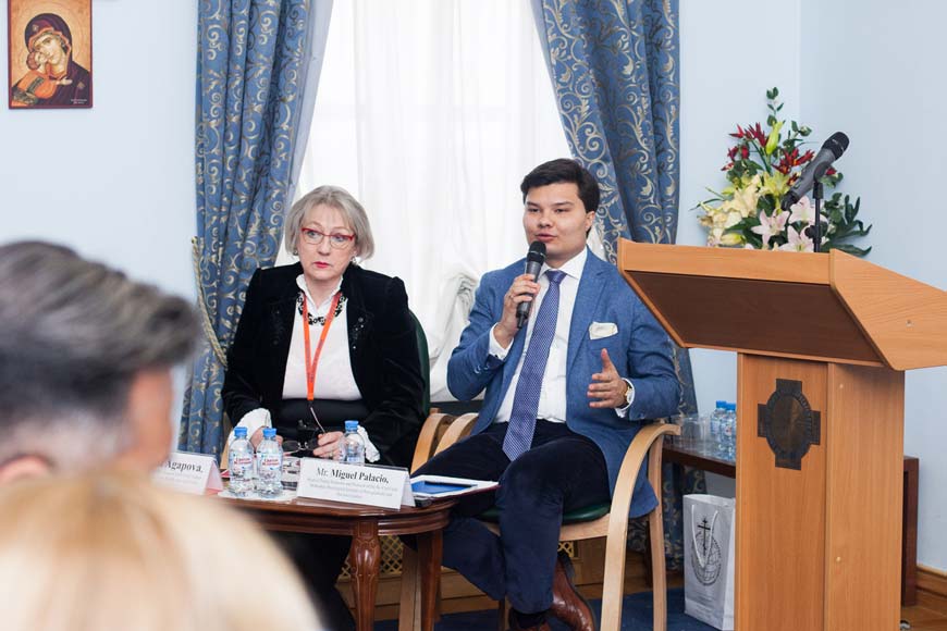 Модераторами круглого стола выступили заместитель Председателя ИППО, руководитель Общественного Центра ИППО по защите христиан на Ближнем Востоке и в Северной Африке Елена Агапова и руководитель Управления общественных связей и протокола Общецерковной аспирантуры и докторантуры Мигель Паласио.