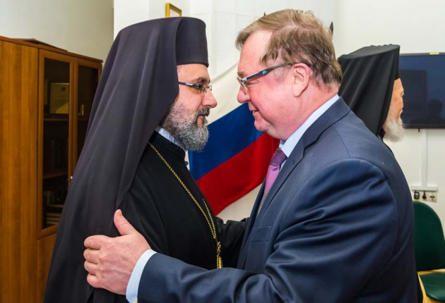 «Ваше Высокопреосвященство! Ваше Преосвященство! Братья и сёстры! Дорогие друзья! Уважаемые послы! Дорогая матушка Агнесс, с которой мы давно не виделись. Рад видеть всех-всех вас. Я хочу поприветствовать также наших сирийских братьев, которые прибыли на наш круглый стол, конференцию, встречу, как угодно это можно назвать. Посвящена она проблемам защиты христианства на Ближнем Востоке, в первую очередь в Сирии.