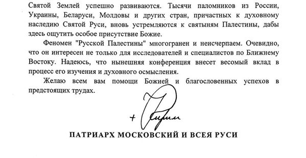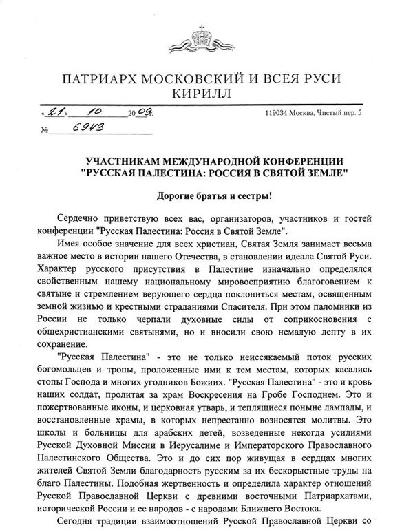 Приветствие Патриарха Московского и всея Руси Кирилла, участникам международной конференции «Русская Палестина: Россия в Святой Земле»