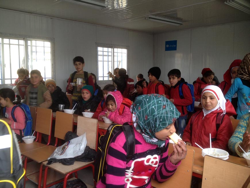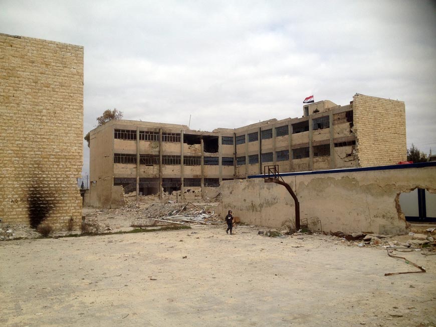 В тот же день российские гости в сопровождении игумена Арсения посетили одну из общеобразовательных школ на востоке Алеппо, в части города, наиболее пострадавшей от террористов. В настоящее время здание учебного заведения лежит в руинах, и уроки проходят во временных вагончиках, установленных в школьном дворе. Прибывшие из России подарили всем 480 ученикам школы учебные наборы и подарки, собранные ветеранской организацией «Боевое братство».